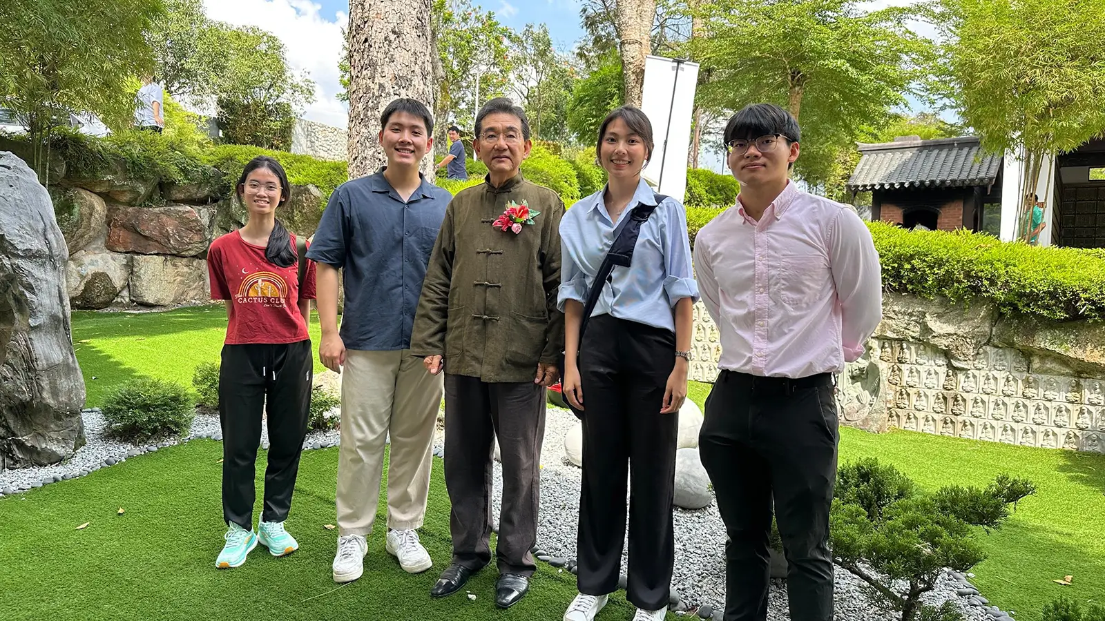 2005年游北京、曼谷,虽然老师已是94岁,但他健步如飞,逛北京各名胜地,那都没有行动不便之处。其实我们每天编排的行程他能应付自如。记得一天早晨我们很早就到清华大学的校外公园,看到一群妇女在耍太极扇。老师突然走过去也参加她们做晨操。过后也跟她们寒暄一阵,老师当时心情的开朗可想而知!