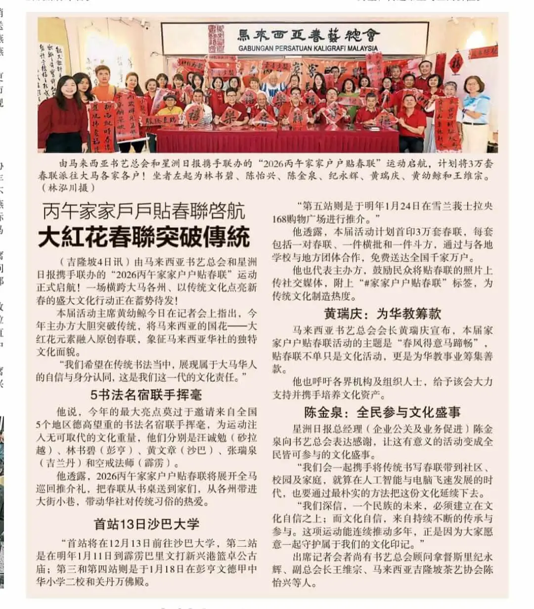 数十年来,星洲日报和马来西亚书艺协会合作无间。例如,近三十年来,彼此都是雪兰莪帝沙再也华文小学主办的丹斯里陈金火杯全国书法公开赛”的协办单位,三十五年来也是雪隆海南会馆主办的“全国挥春赛”的协办单位。